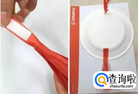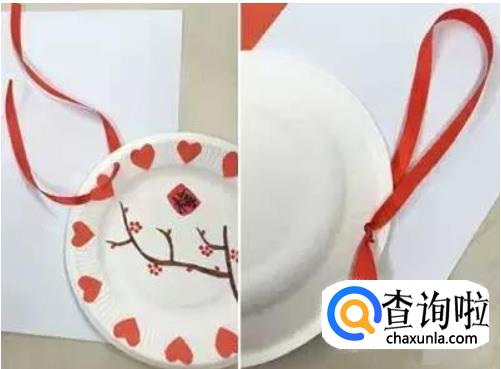 再用打孔器在盘子的正上方打出一个孔,穿入一根红丝带,两端打结,这样挂绳也搞定咯!