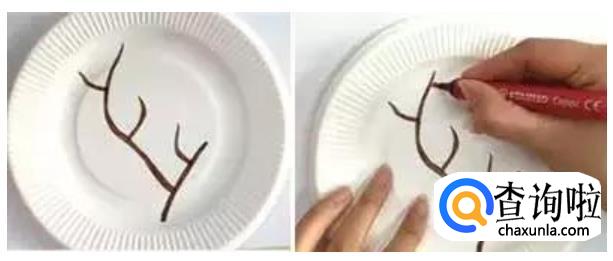 首先,我们用咖啡色的彩笔在白色纸盘的右下方画出第一根树枝;在这根树枝底部向上,大约3mm处,再画一条长长的曲线,又一根枝干画好啦!以此类推,在长枝干的空白处,继续画出短短的枝干,梅花树的雏形就诞生了。