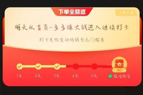 拼多多为吸引用户消费开展了很多返现活动,像新人全额返、下单全额返,那么针对这些返现活动,很多人质疑这些活动的真实性,其实拼多多下单全额返活动是真的。参与了全额返用户的活动需要连续打卡七天,等到打卡7天后,就能获得40元的现金奖励,会直接打到用户的微信账户内,不需要用户手动提现之类的操作。但也有一些条件。