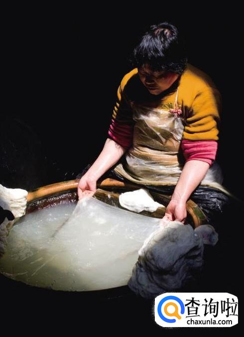 然后把去除掉蚕的蚕茧套进一个撑蚕茧的工具上面,这样子可以把蚕茧撑开,使得蚕丝更加薄。