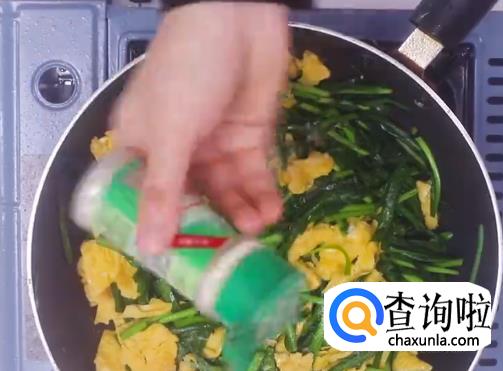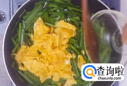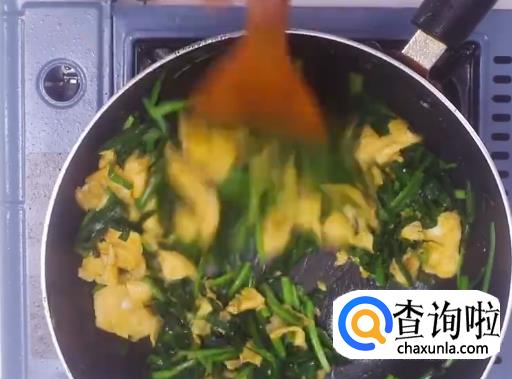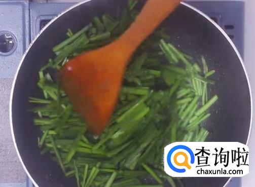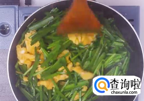 热油下韭菜翻炒,然后倒入鸡蛋块翻炒均匀。
