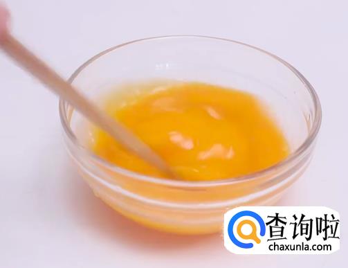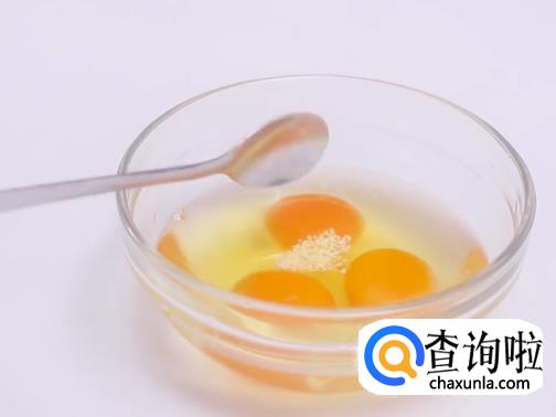 打两个鸡蛋在碗里,然后加一小勺盐巴,搅匀。