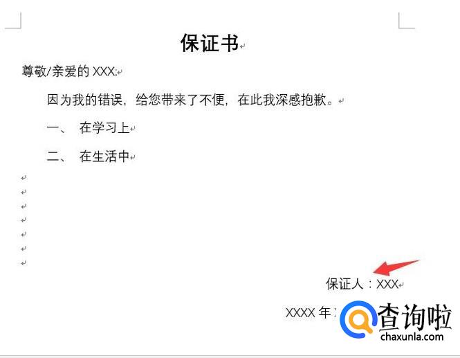 正文写完以后记得最后落款,要有保证人,保证日期。