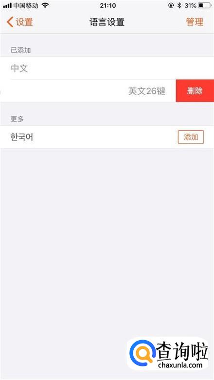 你也可以把语言完左侧滑动,并点击删除也是能够将我们输入法中的不想用的语言删除。