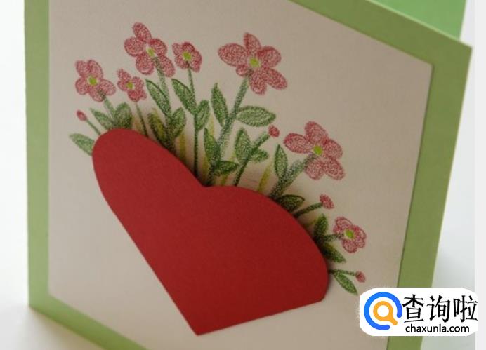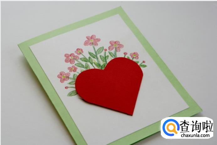 最后,把裁剪好的红色心形结构粘贴在白色卡片上,如下图所示,这样贺卡就制作好了。