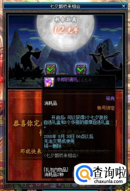 当牛郎和织女的剩余距离为0光年时,即可领取一个【牛郎的谢礼】,开启后可以获得1个“七夕装扮自选礼盒”和1个“华丽的徽章自选礼盒”。