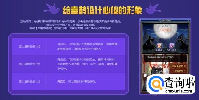 完成每个阶段可以获得对应的“喜上眉梢礼袋”,开启后分别可以获得喜鹊的恢复药剂、特训药剂以及宠物私聊。