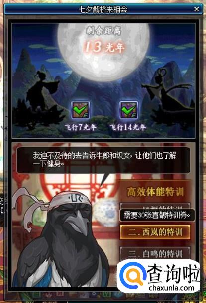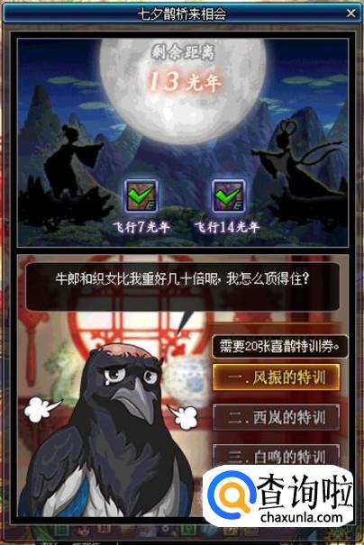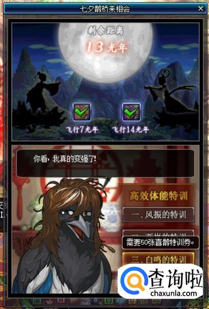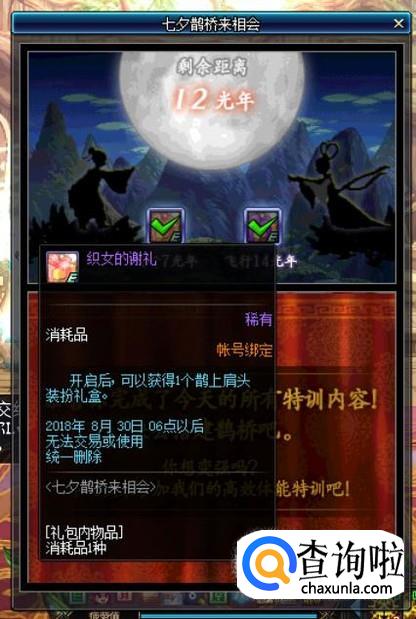 完成每日的特训任务可以减少1光年的距离(初始距离为14光年),当牛郎和织女的剩余距离为7光年时,即可领取一个【织女的谢礼】,开启后可以获得一个“鹊上肩头装扮礼盒”。