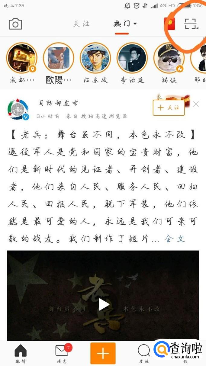 打开手机上的新浪微博客户端,点击右上角的图标,如下图所示
