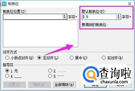 在这里我们就可以设置对齐方式,小编以居中对齐为例介绍,右上方是要清除制表位字符设置,如图。