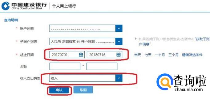 进入查询明细页面,设置查询起止日期,比如我演示查近一年的工资收入,设置时间后,在收入支出类型项,选“收入”,点击确认。