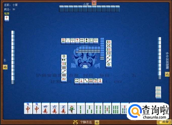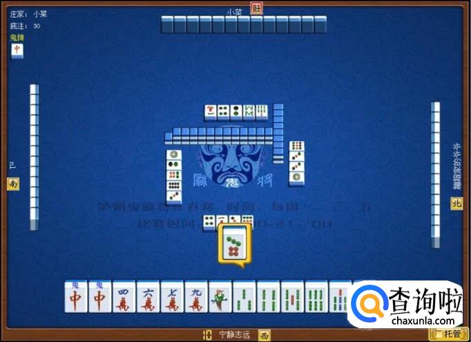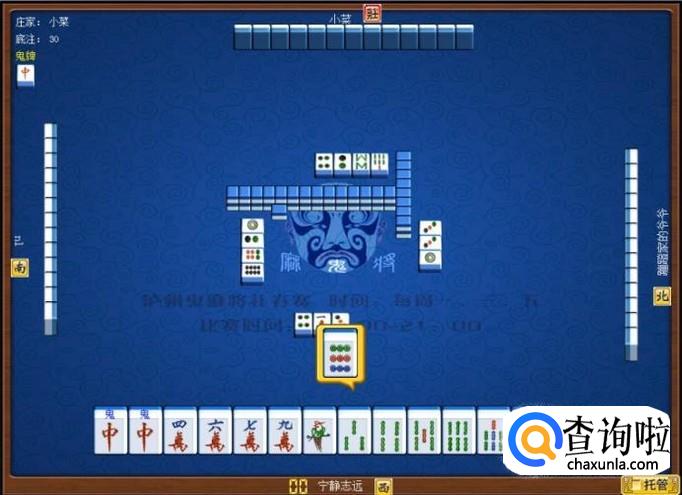 下家摸牌打三筒,庄家摸牌打四筒,顶家摸牌打八筒。本家摸牌,本家摸到红中(鬼),本家打出九筒,这样,本家就打缺筒子这门牌了。