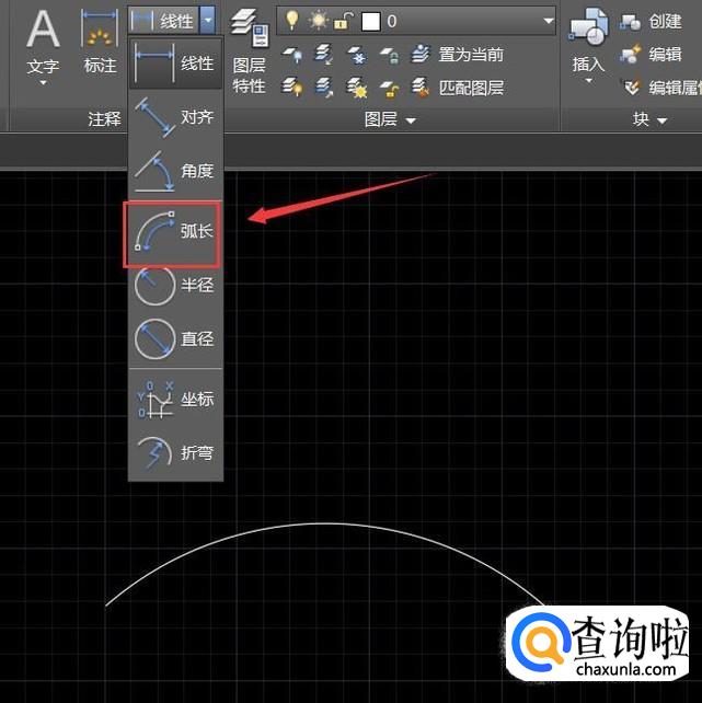 选择圆弧选项之后在绘图区里绘制一段圆弧,然后在找到标注里的圆弧标注选项,如图所示: