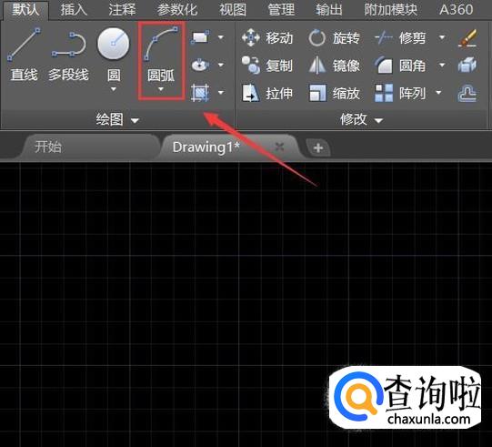 打开CAD之后在常用菜单里找到圆弧选项,如图所示: