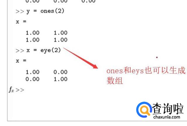 最后可以用ones和eye两个函数声明数组,ones是生成元素值为1的矩阵数组,eye是生成对角矩阵数组,如下图所示