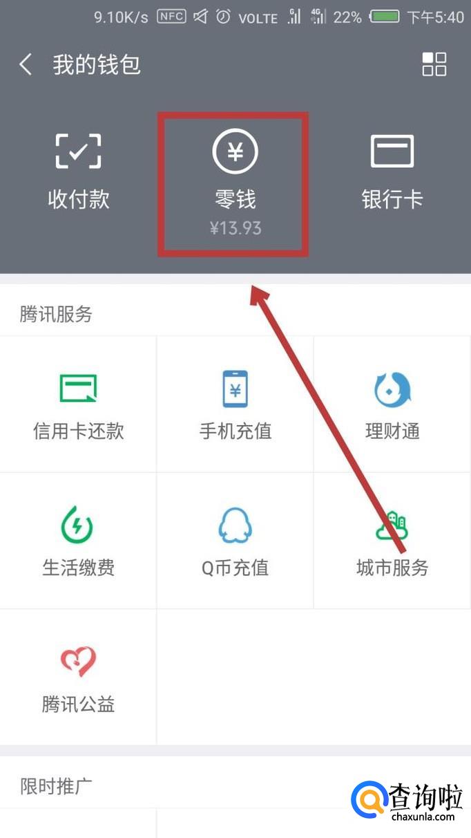 这样我们就进入到【我的钱包】里了,在上面找到【零钱】,点击进入。