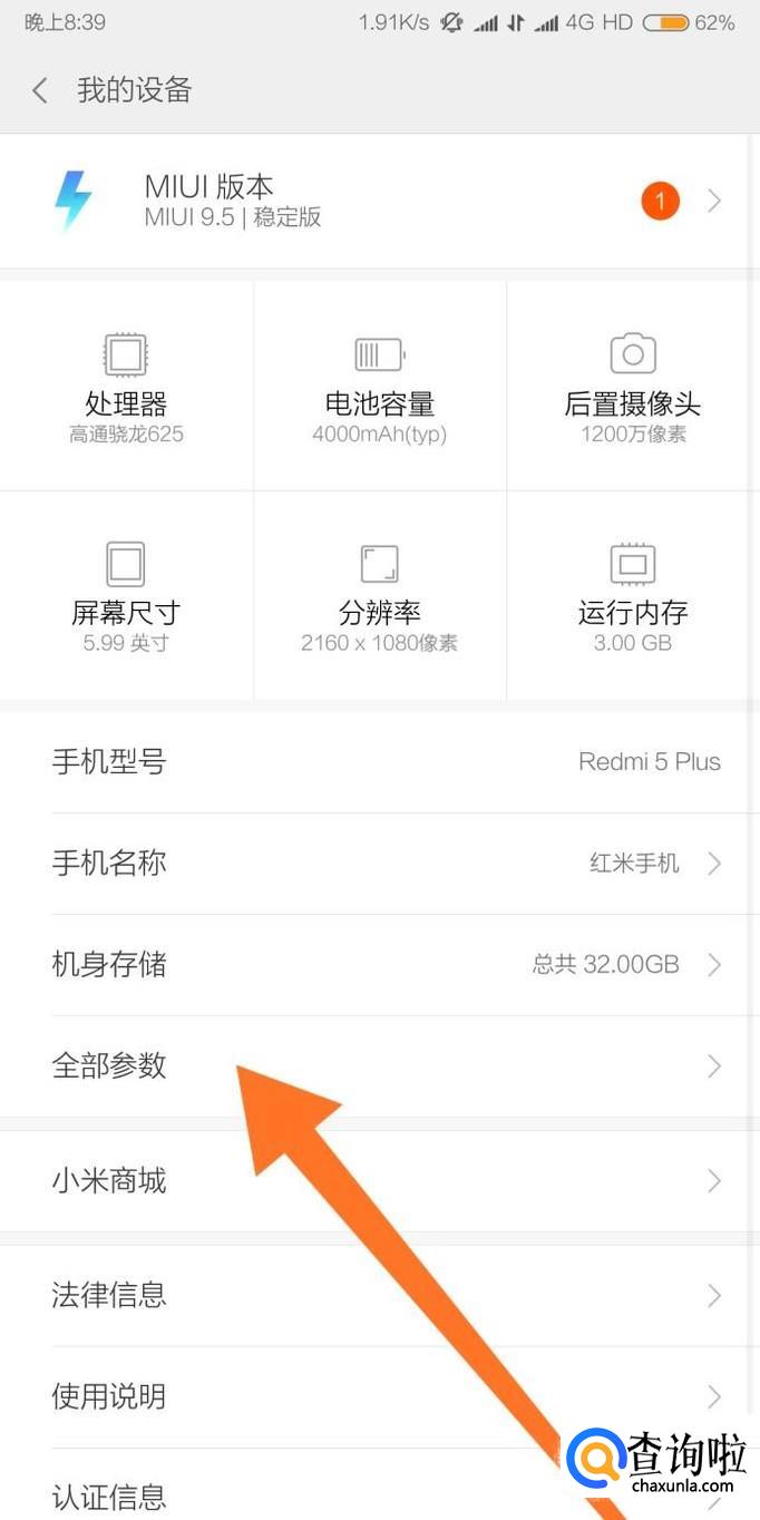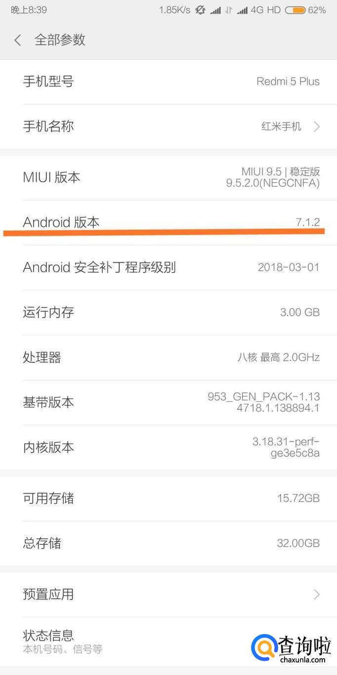 最后就能看到小米手机的 Android 版本号,除此之外还能看到手机其他重要参数。