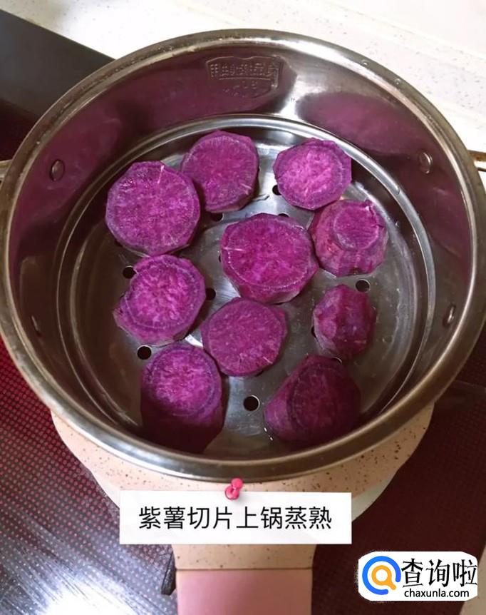 然后将紫薯切成片,上锅蒸15分钟,如下图所示。