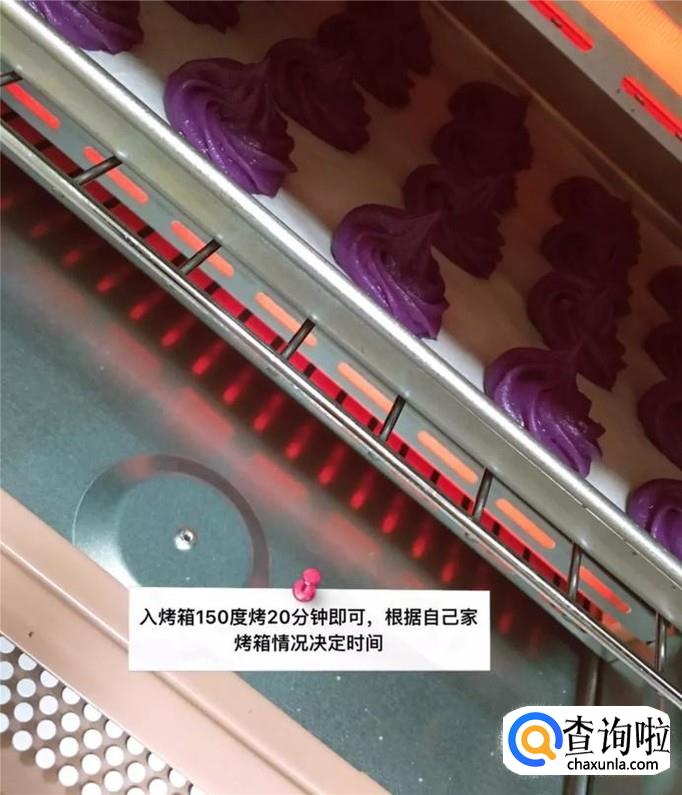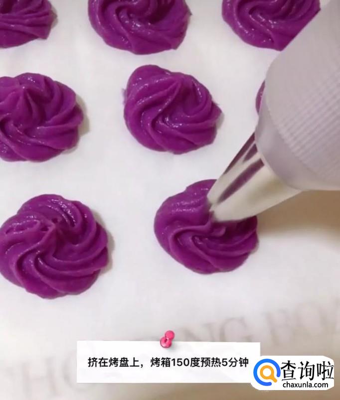 接着把紫薯泥挤到烤盘上,如下图所示。小贴士:1.大家在挤紫薯泥的过程当中,注意要间隔开来。2.为了方便脱膜,大家可以在烤盘上适量刷上一层食用油,这样会比较好。