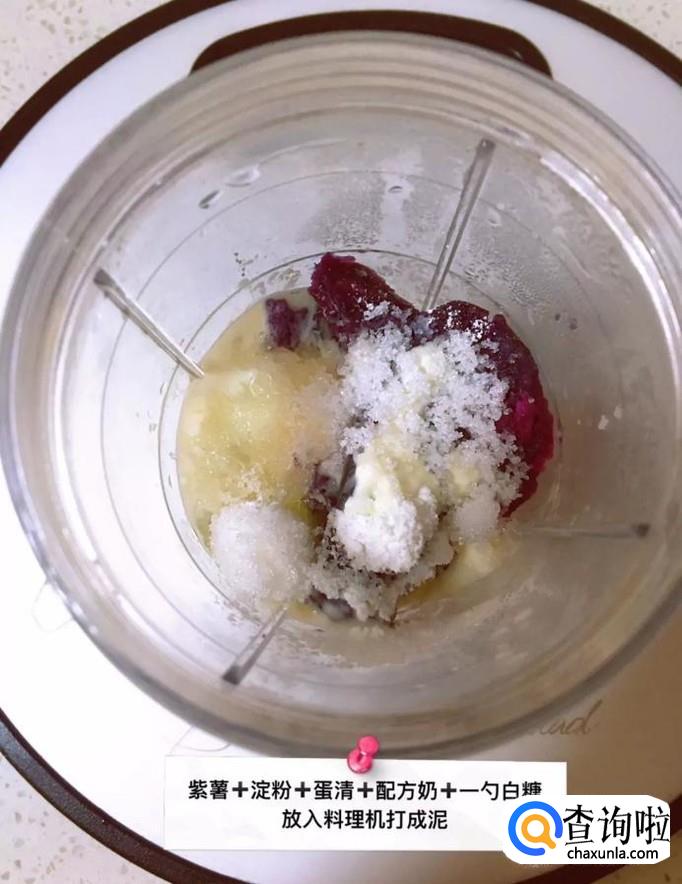 接着将蒸熟的紫薯倒入料理机,之后依次加入淀粉、蛋清、配方奶和一勺的白糖打成泥,如下图所示。