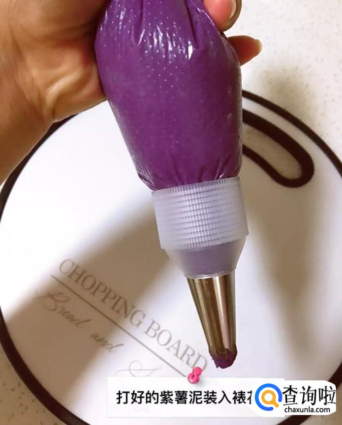 然后将打好的紫薯泥装入裱花袋,如下图所示。小贴士:裱花嘴的选择,大家可以根据自己的喜好来决定。