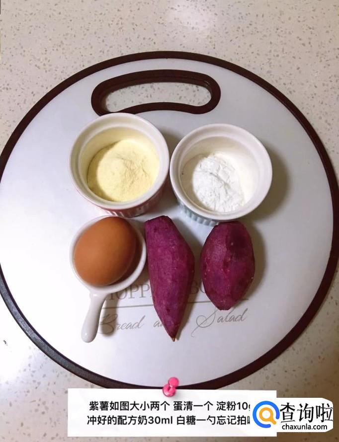 首先准备好所有的食材,如下图所示。小贴士:紫薯两根,蛋清一个,淀粉十克,配方奶30ml,白糖一勺。