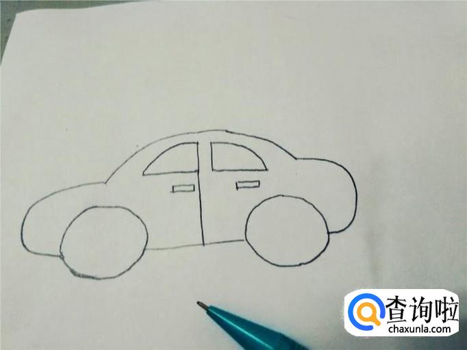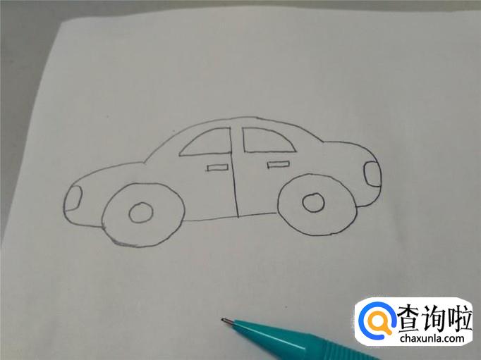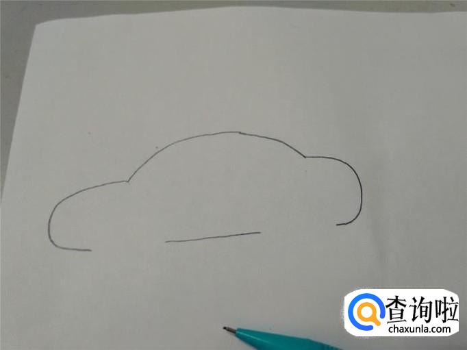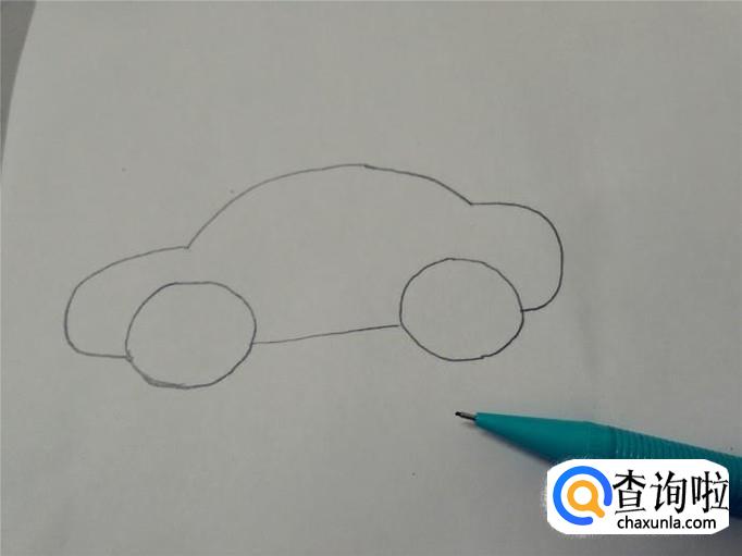先画车的轮廓,上面鼓鼓的是车顶,两侧鼓出来的是车的前后两端,底下留出两个车轮的宽度,中间只画一横线,表示车的底盘。