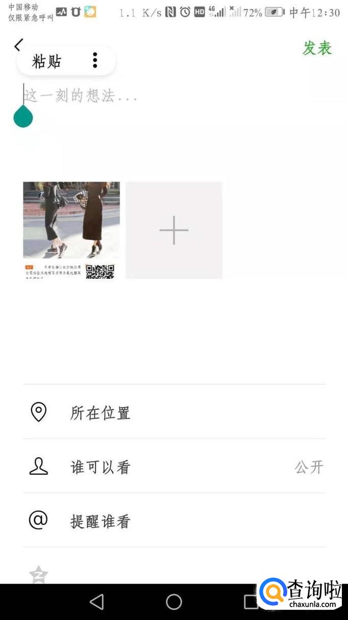 直接打开微信朋友圈像平时发表自己说说那样,相信这个大家都会,这个时候,选择刚刚保存的照片,然后在空白处选择“粘贴”,会把刚刚自己复制好的文案显示出来。