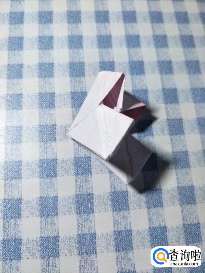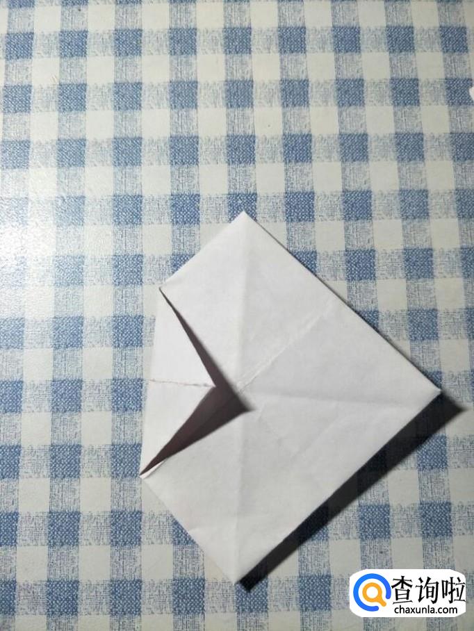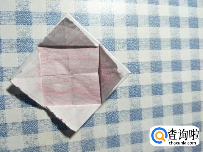 把折纸翻一个面,则又出现四个小正方形,将小正方形的内侧角向外折叠至与大正方形的角重合。