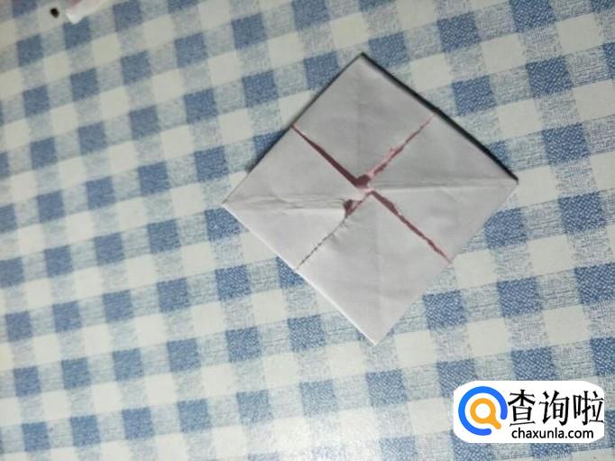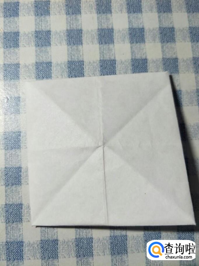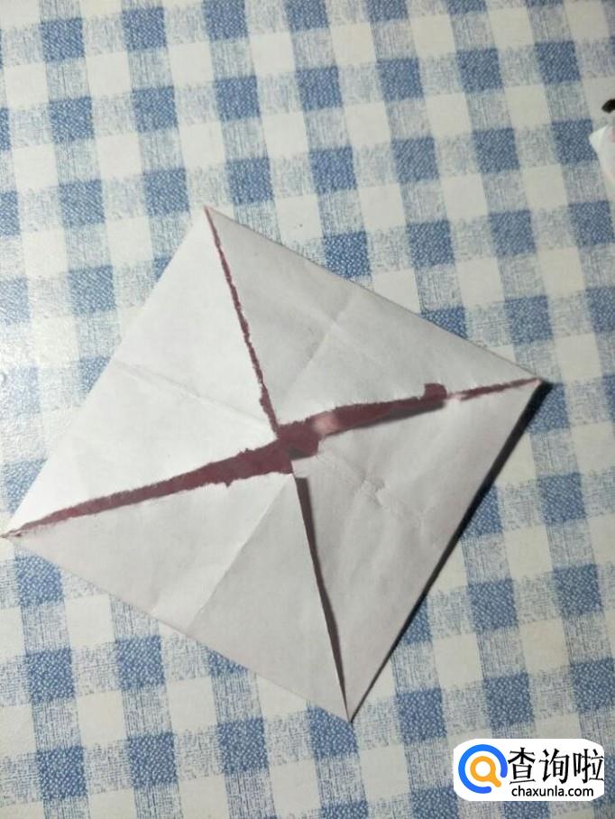 打开后,可以看到上一步中留下的折痕,将四个角向纸的同一面沿折痕折叠至中心,这就是上一步的作用啦!