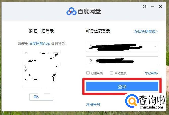 如果你还有百度网盘的账号,那么你就点击注册后再登录,如果有了账号和密码直接登录就行。