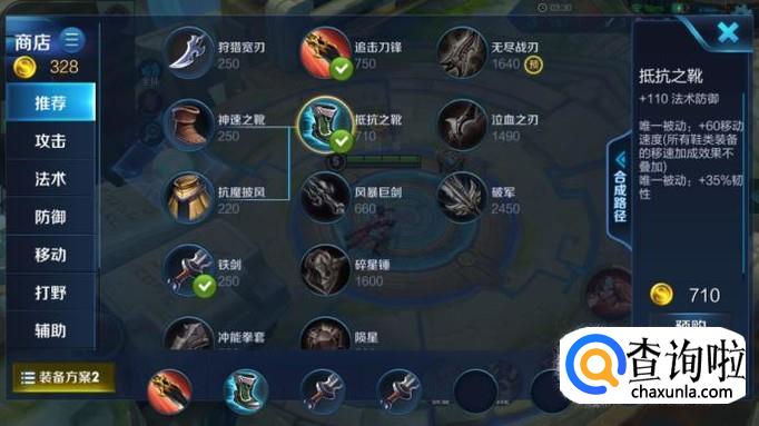 然后接下来可以出一双那个“抵抗之靴”,这个可以增加荆轲的移动速度和魔法抗击能力,以防被秒。