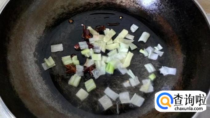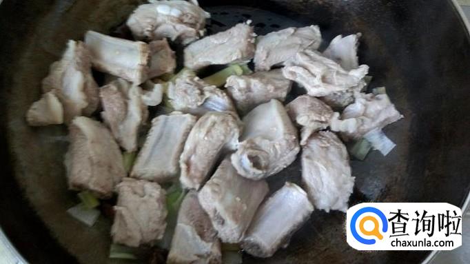 这时炒锅放适量油,倒入备好的葱、姜、辣椒、八角炝锅,然后倒入焯水的猪肋排,大火快速翻炒片刻。