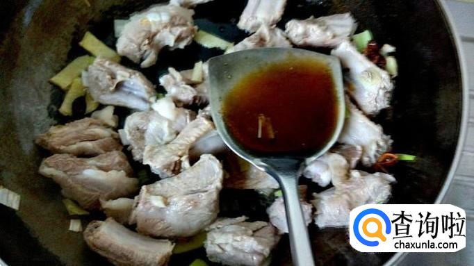 翻炒片刻的猪肋排这时可以加一铲子食醋,加食醋的目的是既去腥味,也会起到嫩肉的作用,加醋后快速翻炒3分钟左右。