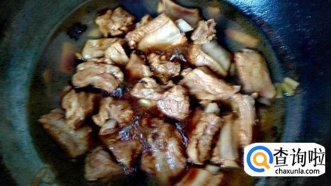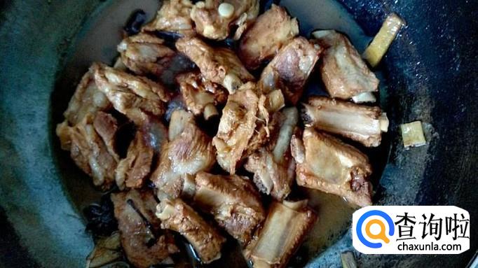 加过酱油的排骨颜色会比一开始炖时要好看些,继续小火慢炖,整个过程中时不时的翻炒一下,以免少量水炖糊锅。
