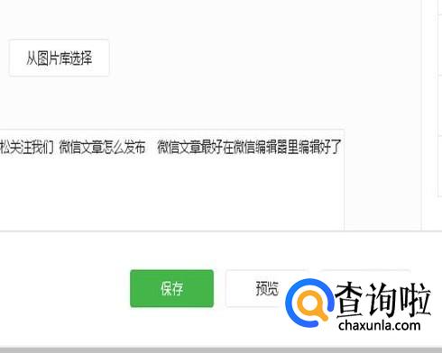 文章编辑好后,没发送之前想在手机微信上看看文章效果,可以点击“素材库”“编辑框”底部的“预览”,输入你的手机微信号就可以在手机微信上看到你的文章了(注:预览前你得先关注该微信公众号)。