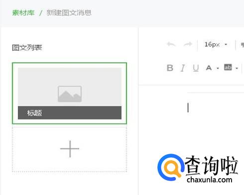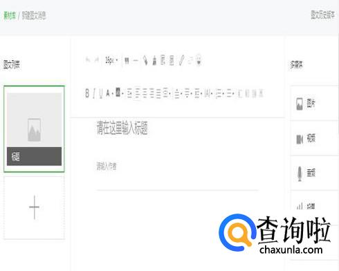 “素材库”左边是图文列表,图文列表下面有个空的文档,点击这个空的文档,中间会出现一个编辑框,右侧是“多媒体”。文章在编辑框里编辑,在文章里插入图片、视频什么的,可以在“多媒体”里选择相应的功能键上传“图片”或“视频”,编辑好后文档里会显示文章的标题和封面图片。