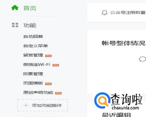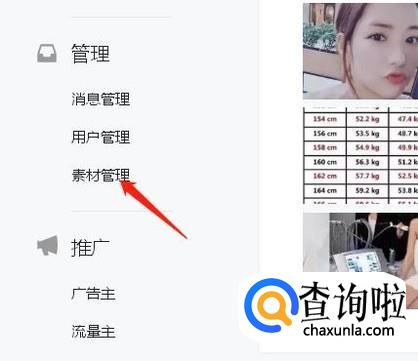 微信公众号首页左侧有一个功能区,分别是功能——小程序——管理——推广——统计——设置——开发。在“管理”里面找到“素材管理”,单击打开。