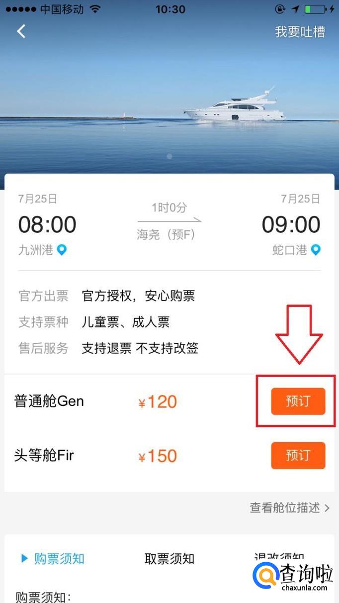 根据时间选择好班次后,进一步选择舱位等级,然后点击“预定”。