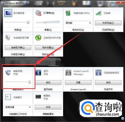 我们可以在Windows移动中心看到“键盘亮度”选项卡,我们通过拖动滑块也可以调节背光亮度。