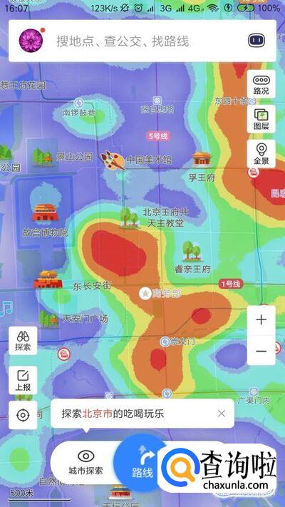 最后,在搜索结果页面中就可以看到当前显示的景区热力图了,颜色较深的地区则代表景区人数很多。