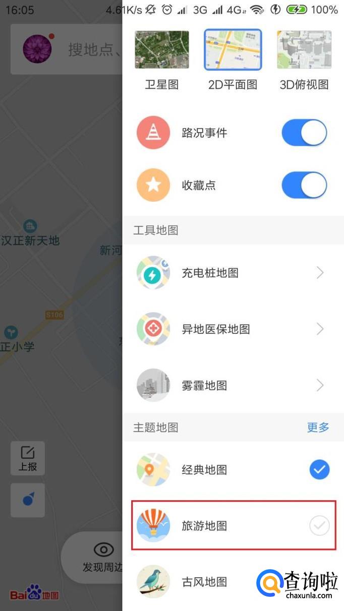 接下来,在弹出的页面中,将地图切换为“旅游地图”,更改当前显示的地图模式。