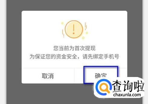 如果是首次提现,页面会提示先绑定手机号,点击【确定】;