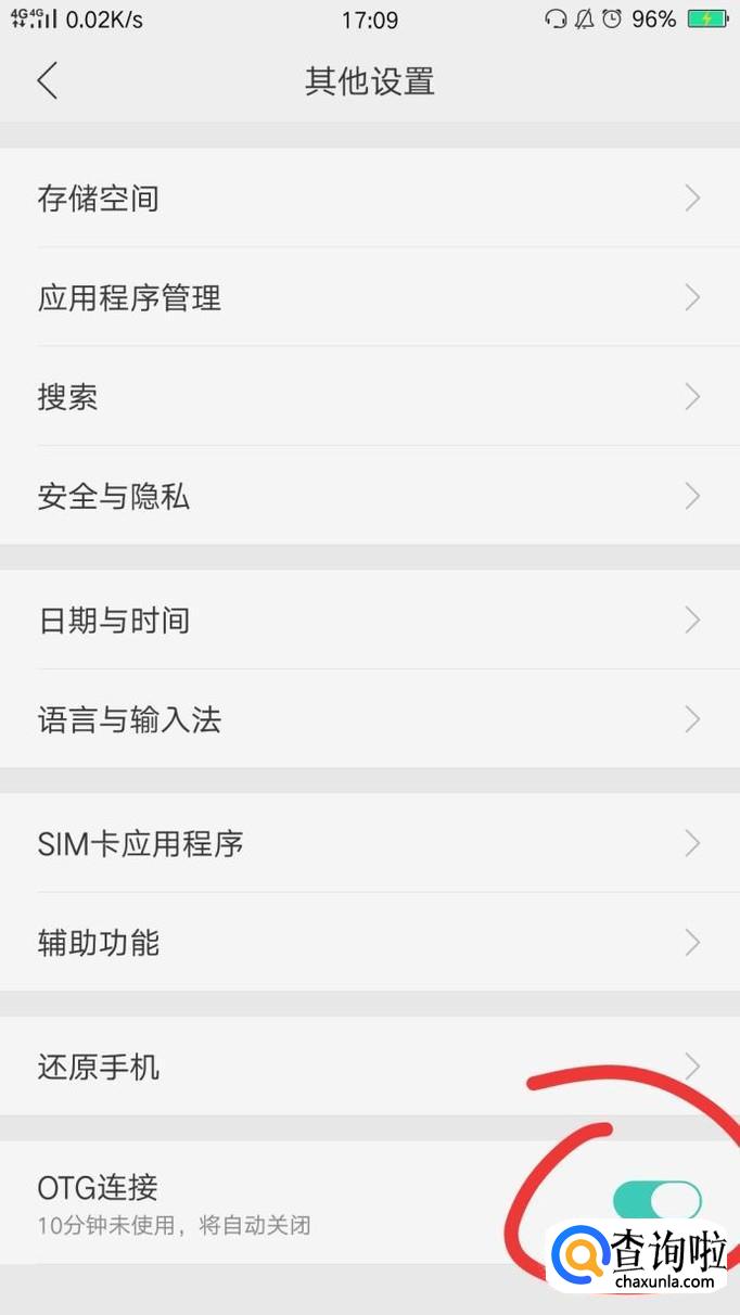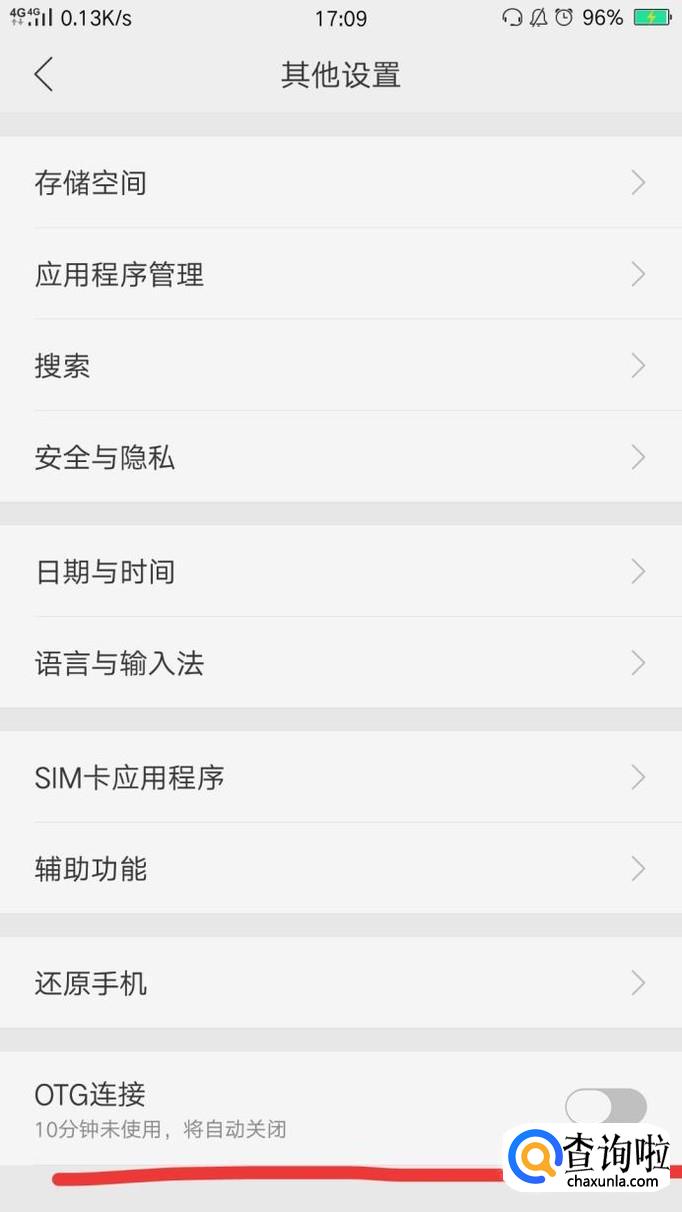 滑动屏幕,找到OTG连接,可以看到默认设置是关闭的。