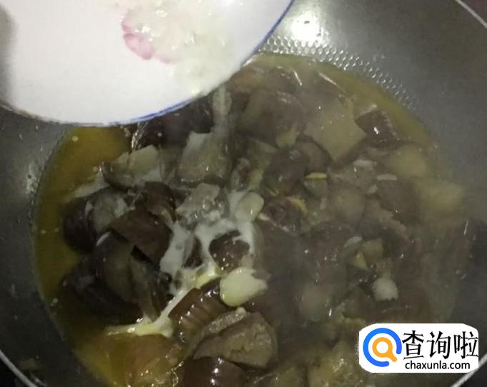 将淀粉用水调匀后,倒入炒熟的茄块中,翻炒均匀。