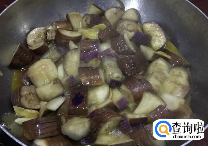 翻炒茄块,炒至茄块软熟后,加适量盐和生抽。