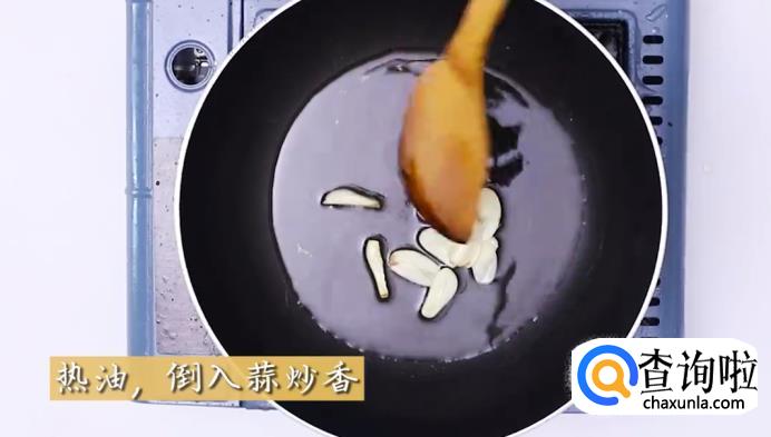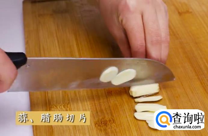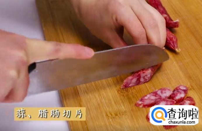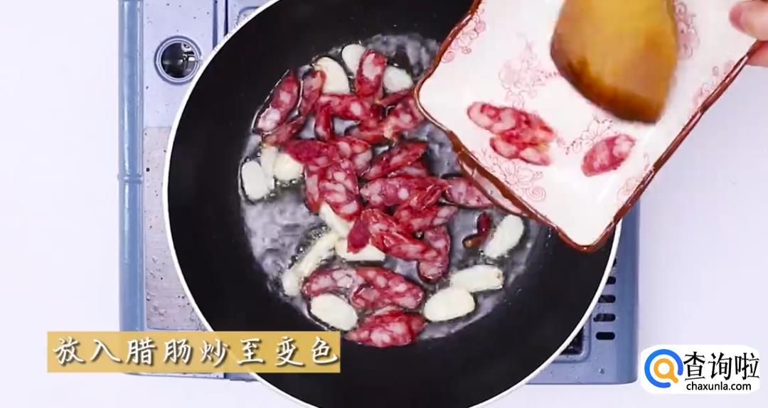 蒜炒香后,放入腊肠翻炒,直至腊肠变色。
