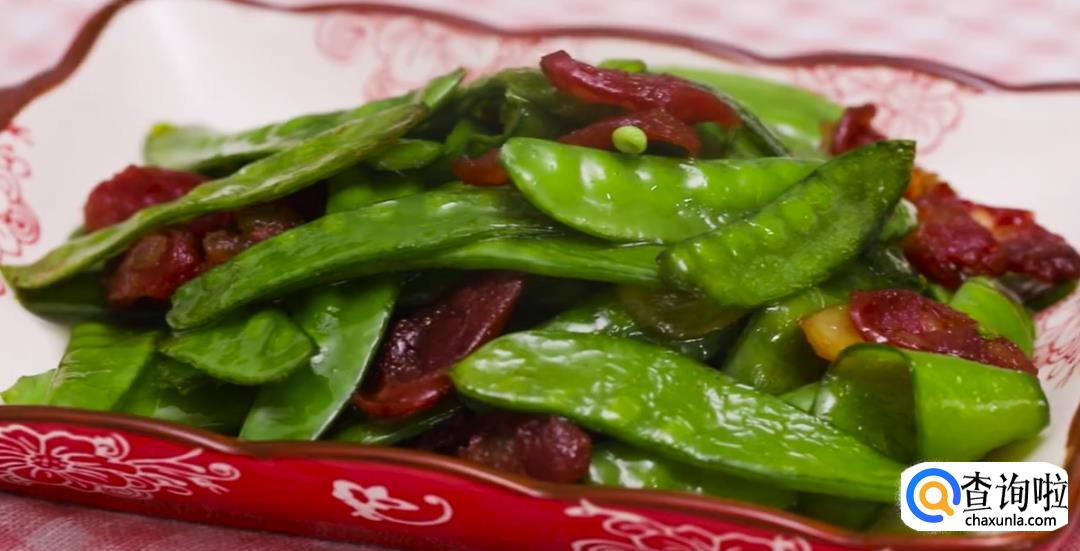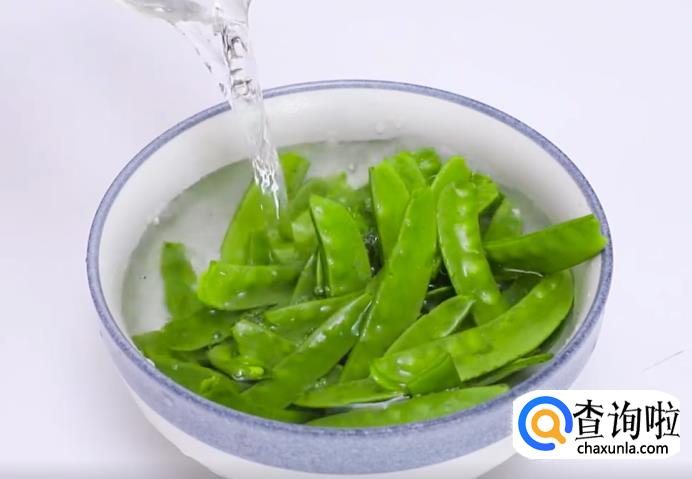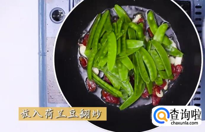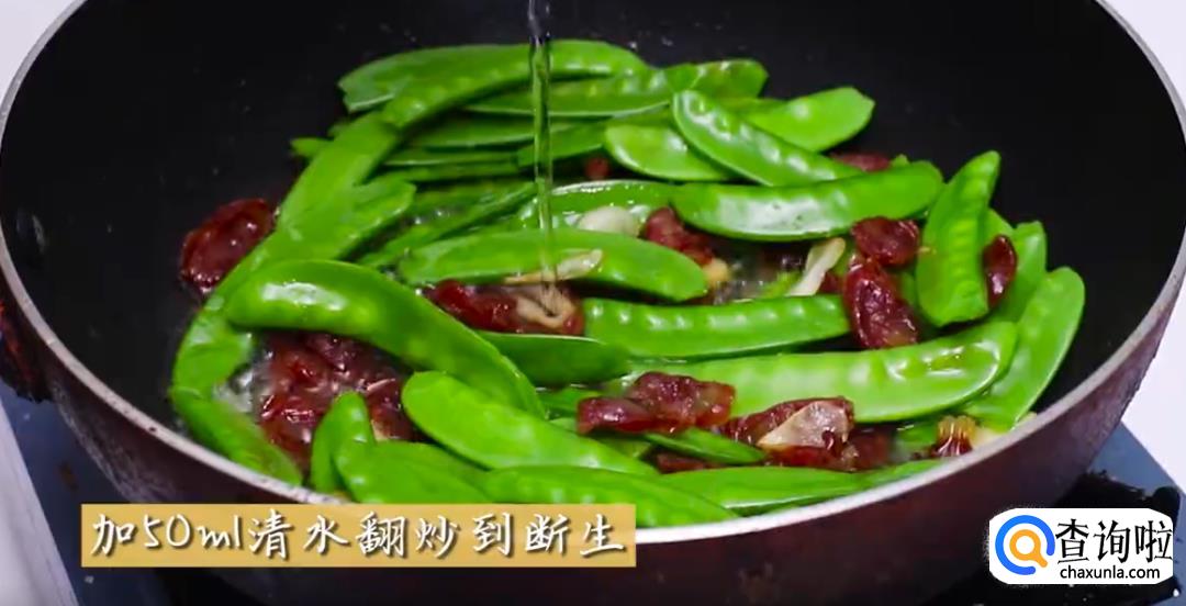翻炒均匀后,加入50ml清水翻炒至荷兰豆断生(熟)。