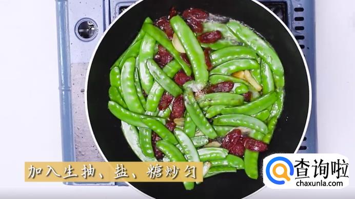 荷兰豆断生(熟)后,加入生抽、盐、糖炒匀即可。