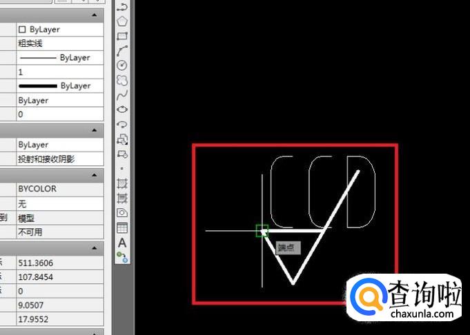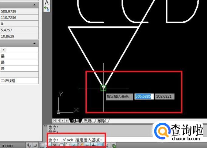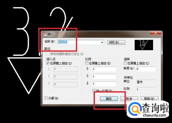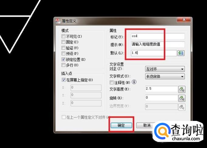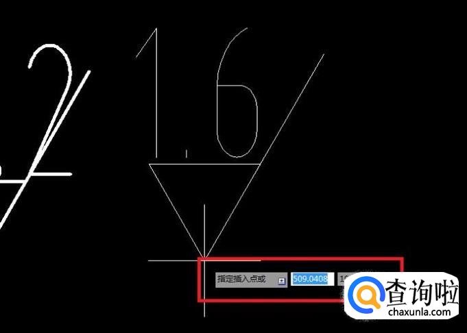 指定插入点:点击粗糙度符号的那个三角形的下面那个尖点,回车。